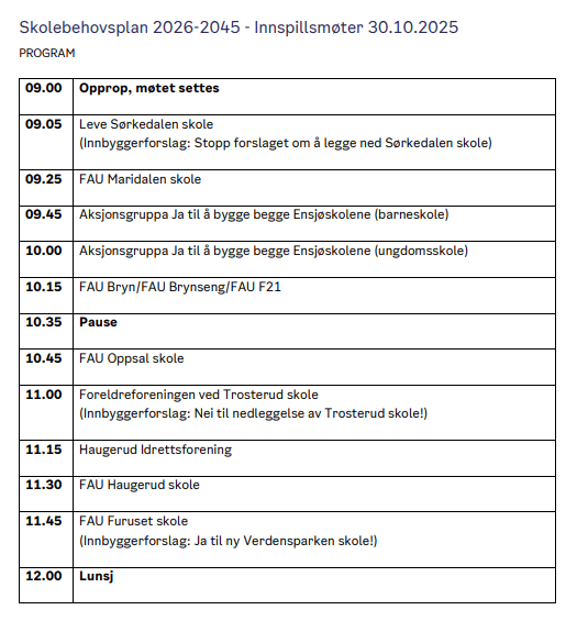Det blir appeller fra skolene som kommer, og så er det flere politikere som har meldt seg på talerlista. Møt opp foreldre og barn, ungdom og alle som bryr seg om en god oppvekst og gode, trygge skoler i byen vår.