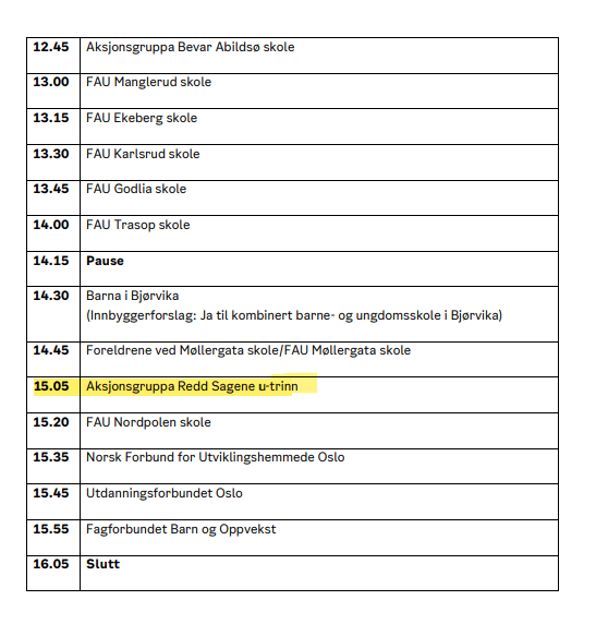 Vi planlegger nå et 15 minutters innlegg om hvorfor vi mener at Sagene 1-10 bør bevares. Vi stiller med flere elever og lærere fra Aksjonsgruppa. Det er et åpent møte så det er mulig å komme for å vise støtte og overvære møte. Redd Sagene U-trinn! har fått taletid klokken 15.05