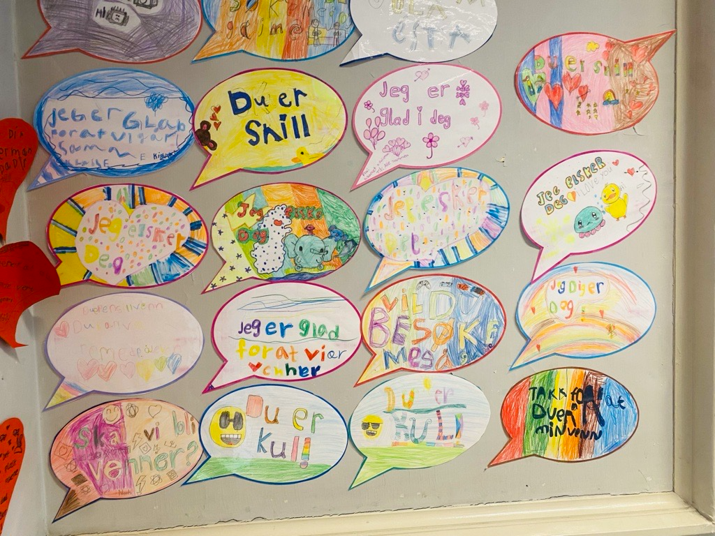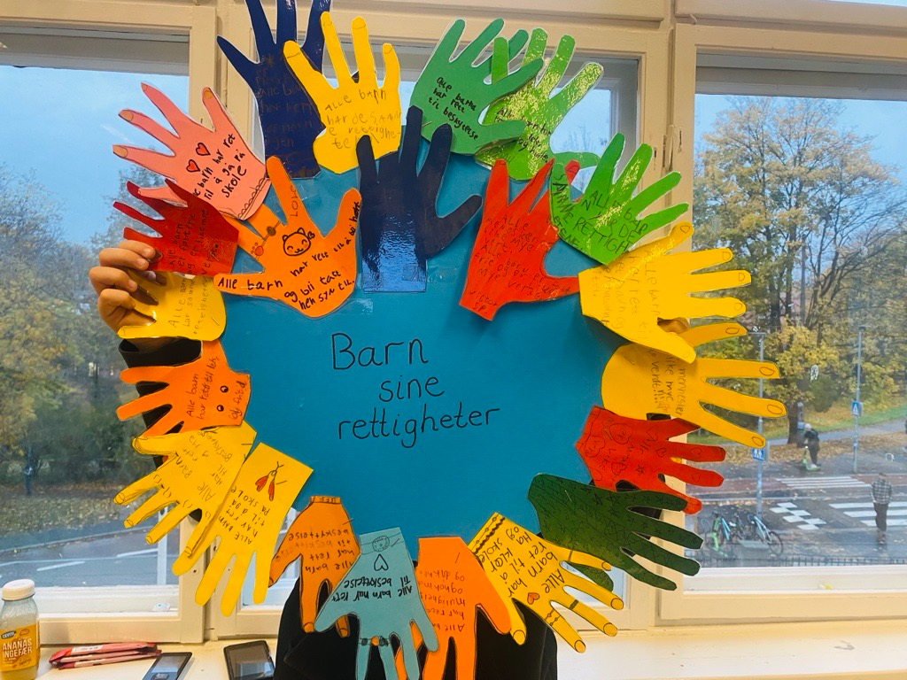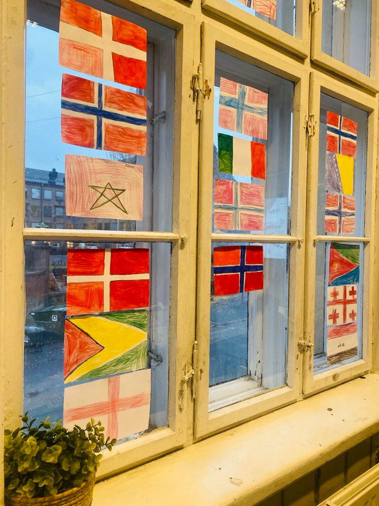 I ukene frem mot FN-dagen har vi jobbet med undervisning til TV-aksjonen og Atlas-alliansens støtte av barn med funksjonsnedsettelser. Vi har tegnet flagg fra mange land og den 24. oktober sang vi Vi-sangen med små og store stemmer i skolegården.