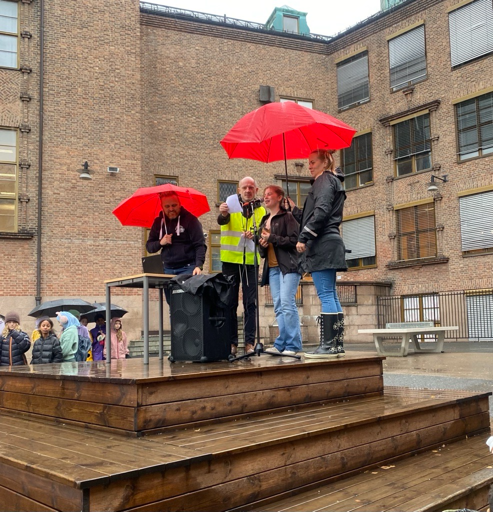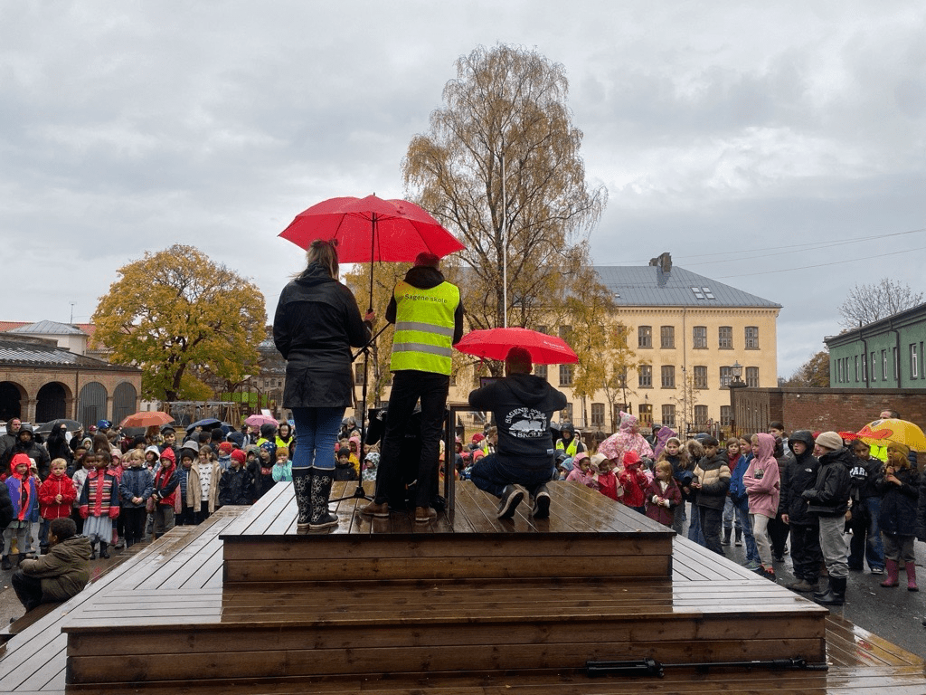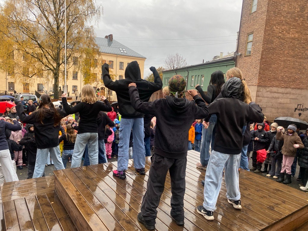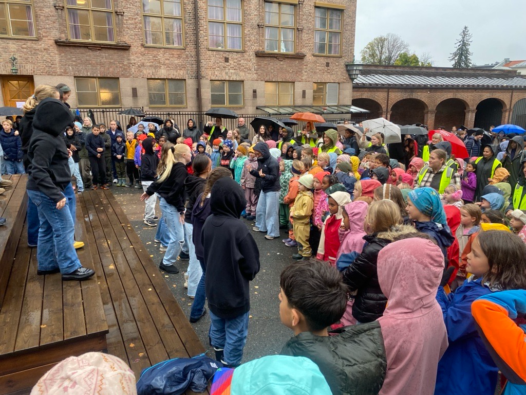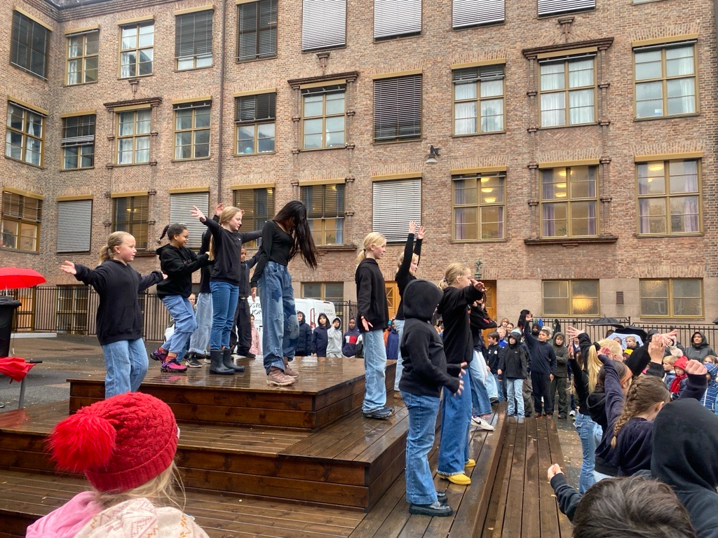 FN-dagen samlet små og store i skolegården til felles sang, taler og opptreden av Sagene Dance Crew! Vi lot oss ikke stoppe av regnet og hadde med oss paraplyer og danset sammen til Sasha. Denne sangen med morsom pardans og klappelek har blitt en herlig tradisjon i felles samlinger.