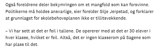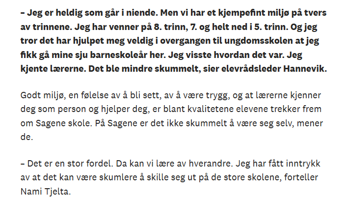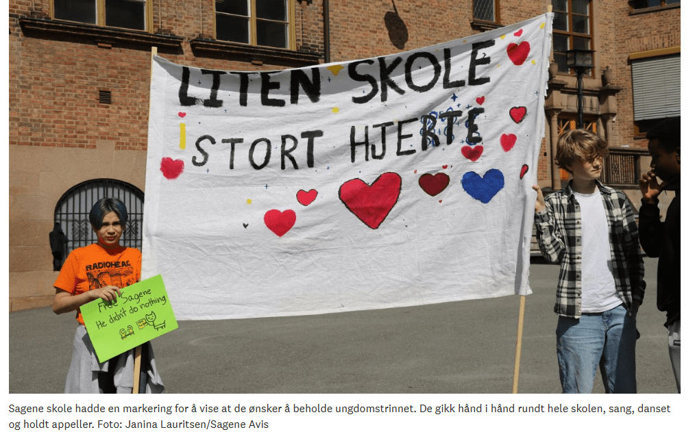 Kjære politikere, Vi skriver til dere som foreldre og innbyggere i Bydel Sagene, med stor bekymring for planene om å legge ned ungdomstrinnet ved Sagene skole. Som foreldre ser vi hver dag hvordan en liten 1–10-skole gir trygghet og tilhørighet. Her blir elevene sett, lærerne kjenner dem gjennom mange år, og det er rom for forskjeller. Denne nærheten kan ikke uten videre flyttes til en stor skole. Ungdomstrinnet er en sårbar fase. Noen ønsker seg til en større skole – men langt fra alle. For mange er en mindre skole akkurat det som skal til for å få en trygg base i en storby med mange inntrykk. To store ungdomsskoler i sentrum nord er ikke det beste for alle barn. Dette handler om tryggheten til barna våre – og om styrken i nærmiljøet vårt. Det er verdt å bevare. Vi ber dere derfor om å bevare Sagene skole som en 1–10-skole. Nedleggelse av ungdomstrinnet vil svekke trygghet, tilhørighet og valgfrihet for barn og familier i bydelen. Små skoler gir bedre inkludering, sterkere relasjoner og et levende nærmiljø – verdier Oslo bør ta vare på.