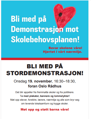 Tusen takk til Katinka Odner, Sageneforelder, som har laget denne plakaten for felles mobilisering for alle de engasjerte skolene. Vi håper så mange som mulig stiller opp og bidrar til å synes sammen i denne historiske demonstrasjonen for å bevare Osloskoler.