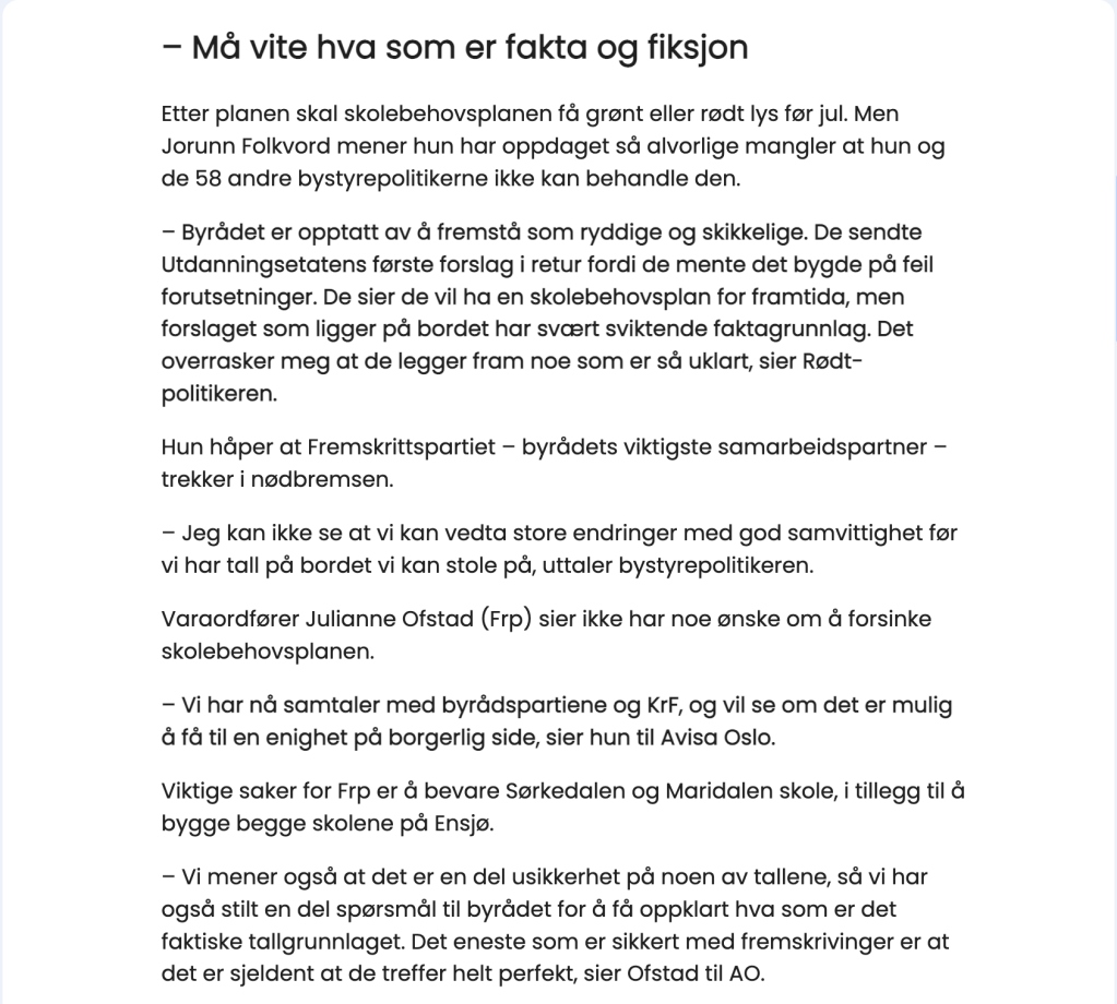 Onsdag ble en trist dag for Ensjø. Til tross for vårt opprop, innspill og folkemøte, velger byrådet å ignorere behovene til vår voksende bydel. Tomten i Grenseveien 65/67 blir ikke nevnt, og forslaget om å kun bygge én kombinert barne- og ungdomsskole for 800 elever, er ikke bare korttenkt – det er direkte uansvarlig. Byrådet påstår at denne skolen vil dekke behovet, men vi sier at dette er et blindspor. Dere har gått imot både våre og fagetatenes anbefalinger for en bærekraftig skolefremtid på Ensjø.