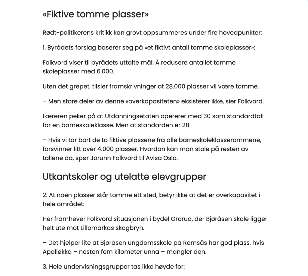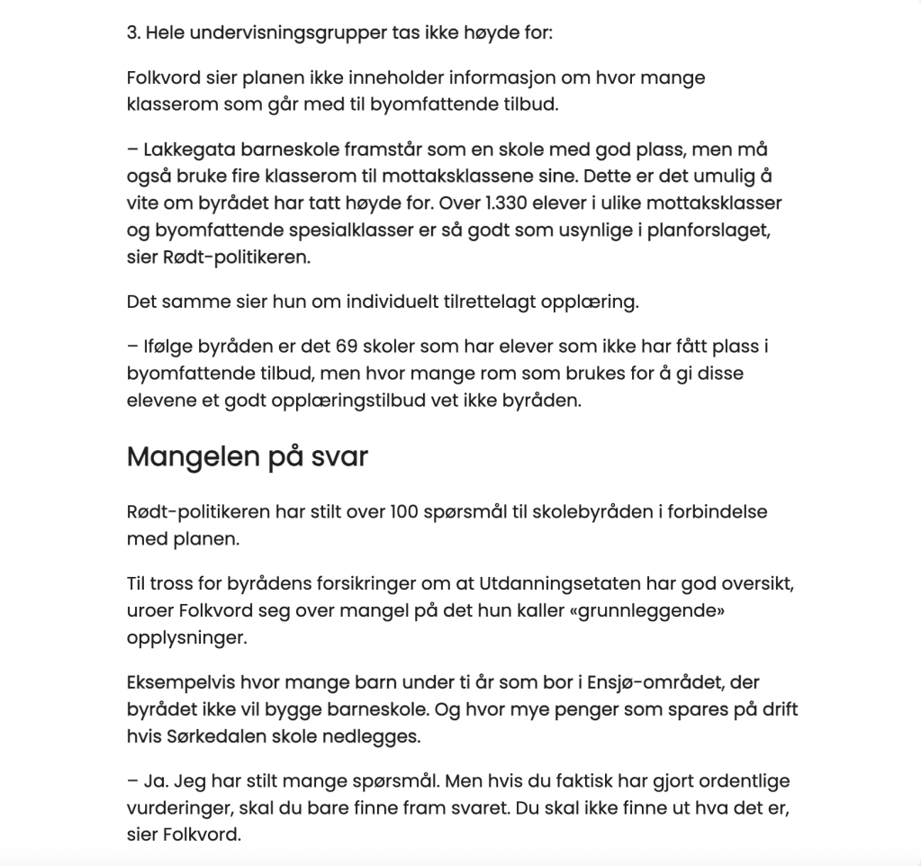 ➔ Og hva med de mest sårbare barna våre? Barn med autisme. Med funksjonsnedsettelser. De trenger små, trygge rammer – ikke åtte paralleller, ikke et system der de forsvinner i mengden. Mange familier har flyttet hit nettopp fordi Karlsrud, Abildsø, Sagene er en mindre skole. Skal vi straffe dem for det?